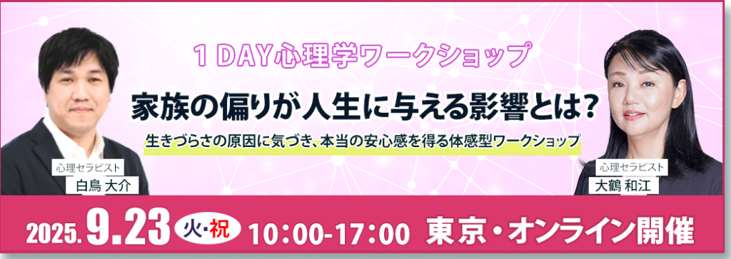 9月23日(火祝)東京にて「家族の偏りや歪みがどのように人生に影響するのか」をテーマにワークショップ、オープンセッションを開催します。